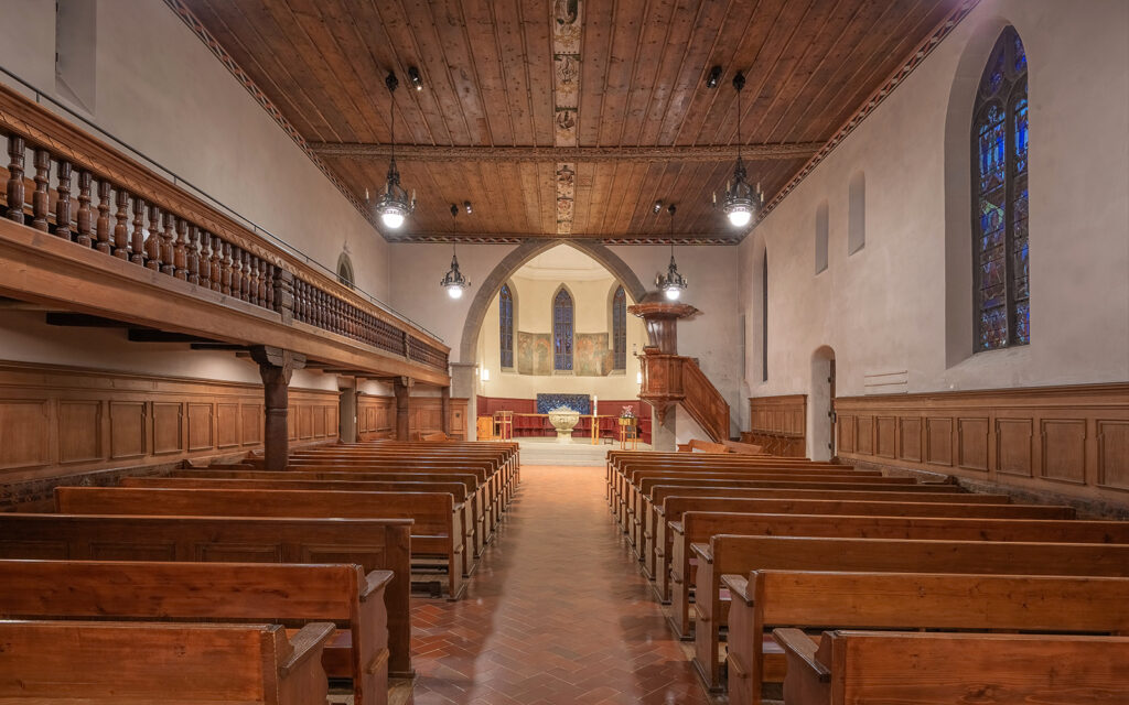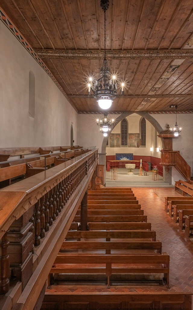 Die Holzdecke stammt aus dem 15. Jahrhundert und stellt eine grosse Herausforderung an die Modernisierung der Beleuchtung.